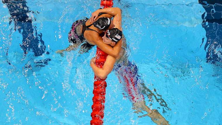 TOKYO, JAPAN - JULY 31: Bronze medalist Simona Quadarella of Team Italy congratulates gold medalist Katie Ledecky of Team United States after competing in the Women's 800m Freestyle Final at Tokyo Aquatics Centre on July 31, 2021 in Tokyo, Japan. (Photo by Rob Carr/Getty Images)