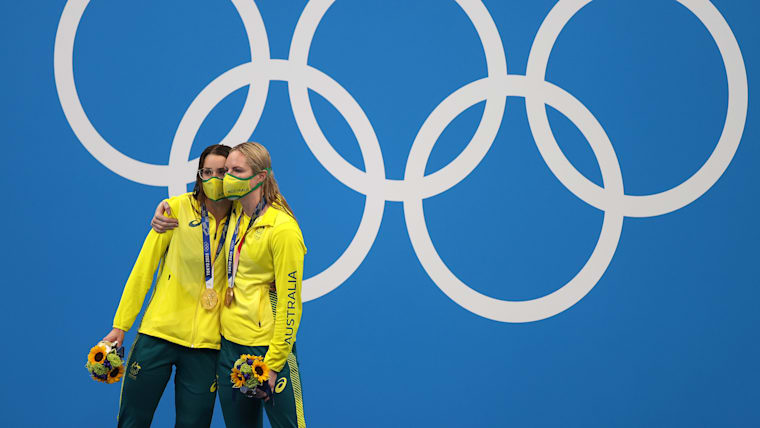 TOKYO, JAPAN - JULY 31: Gold medalist Kaylee McKeown of Team Australia (L) and bronze medalist Emily Seebohm of Team Australia pose on the podium during the medal ceremony for the Women's 200m Backstroke Final at Tokyo Aquatics Centre on July 31, 2021 in Tokyo, Japan. (Photo by Al Bello/Getty Images)