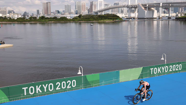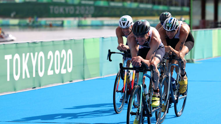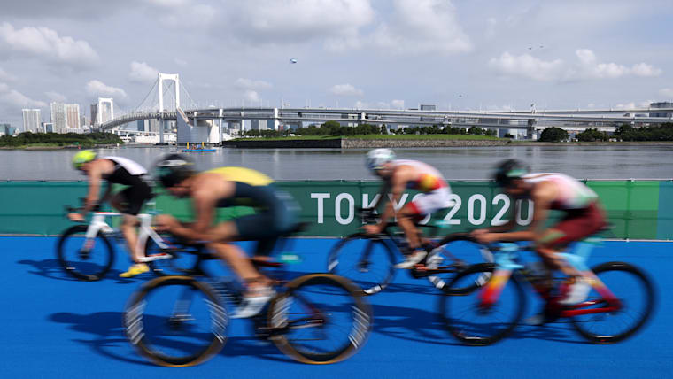 TOKYO, JAPAN - JULY 31: Competitors cycle during the Mixed Relay Triathlon on day eight of the Tokyo 2020 Olympic Games at Odaiba Marine Park on July 31, 2021 in Tokyo, Japan. (Photo by Leon Neal/Getty Images)