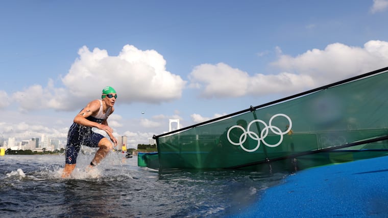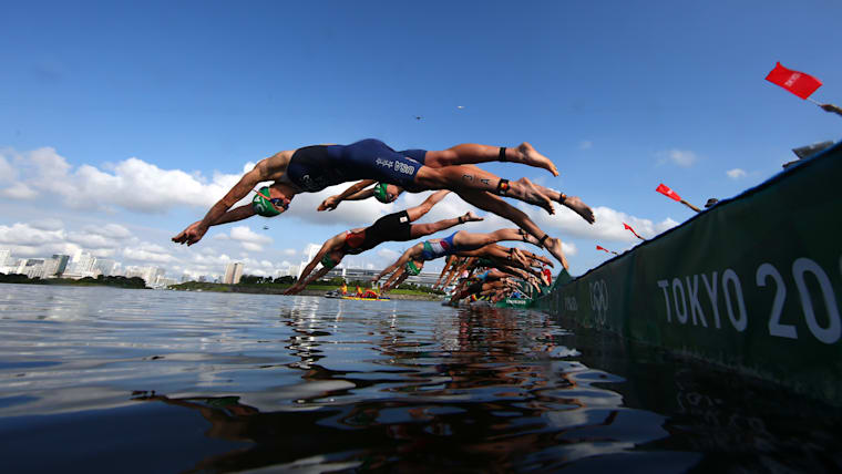 TOKYO, JAPAN - JULY 31: Summer Rappaport of Team United States and other competitors dive during the Mixed Relay Triathlon on day eight of the Tokyo 2020 Olympic Games at Odaiba Marine Park on July 31, 2021 in Tokyo, Japan. (Photo by Charly Triballeau - Pool/Getty Images)