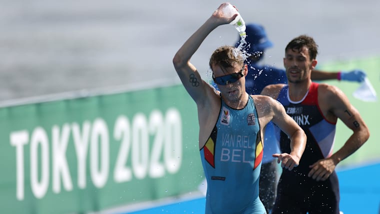 TOKYO, JAPAN - JULY 31: Marten van Riel of Team Belgium cools down during the Mixed Relay Triathlon on day eight of the Tokyo 2020 Olympic Games at Odaiba Marine Park on July 31, 2021 in Tokyo, Japan. (Photo by Leon Neal/Getty Images)