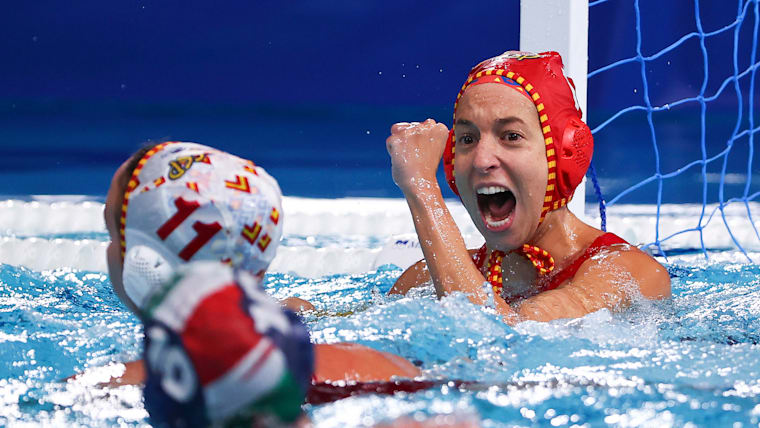 TOKYO, JAPAN - AUGUST 05: Laura Ester Ramos of Team Spain celebrates during the Women's Semifinal match between Spain and Hungary on day thirteen of the Tokyo 2020 Olympic Games at Tatsumi Water Polo Centre on August 05, 2021 in Tokyo, Japan. (Photo by Buda Mendes/Getty Images)