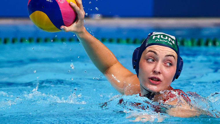 TOKYO, JAPAN - AUGUST 05: Natasa Rybanska of Team Hungary looks for options during the Women's Semifinal match between Spain and Hungary on day thirteen of the Tokyo 2020 Olympic Games at Tatsumi Water Polo Centre on August 05, 2021 in Tokyo, Japan. (Photo by Buda Mendes/Getty Images)