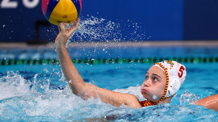 TOKYO, JAPAN - AUGUST 05: Elena Ruiz of Team Spain in action during the Women's Semifinal match between Spain and Hungary on day thirteen of the Tokyo 2020 Olympic Games at Tatsumi Water Polo Centre on August 05, 2021 in Tokyo, Japan. (Photo by Buda Mendes/Getty Images)