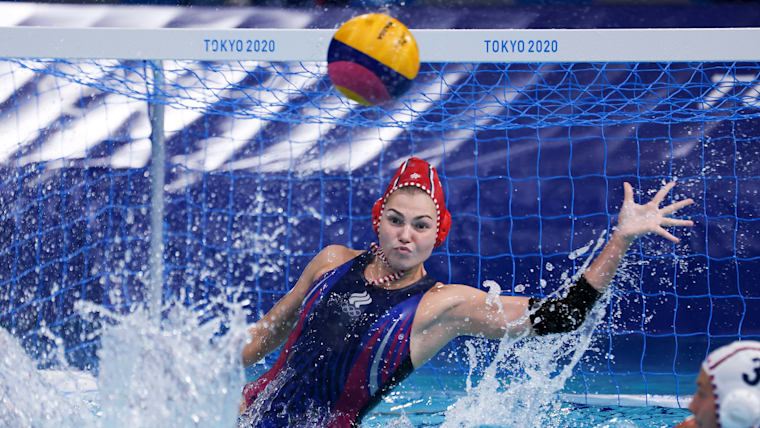 TOKYO, JAPAN - AUGUST 05: Evgeniia Golovina of Team ROC in action during the Women's Semifinal match between Team ROC and the United States on day thirteen of the Tokyo 2020 Olympic Games at Tatsumi Water Polo Centre on August 05, 2021 in Tokyo, Japan. (Photo by Al Bello/Getty Images)