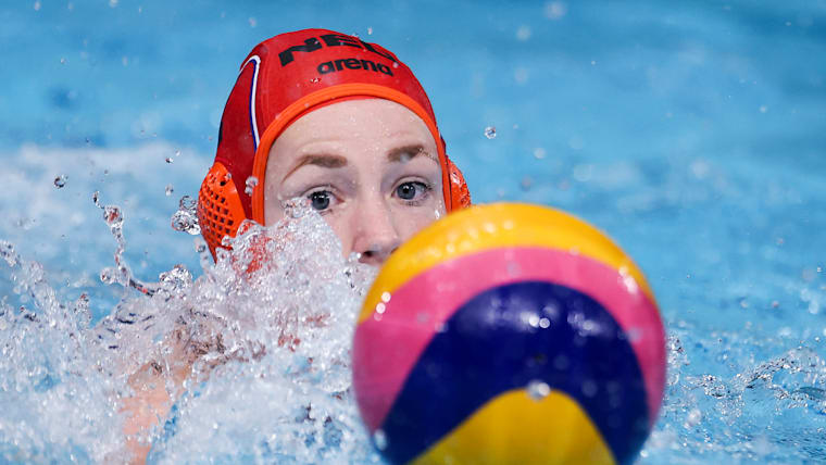 TOKYO, JAPAN - AUGUST 05: Joanne Koenders of Team Netherlands in action during the Women's Classification 5th-8th match between China and the Netherlands on day thirteen of the Tokyo 2020 Olympic Games at Tatsumi Water Polo Centre on August 05, 2021 in Tokyo, Japan. (Photo by Al Bello/Getty Images)