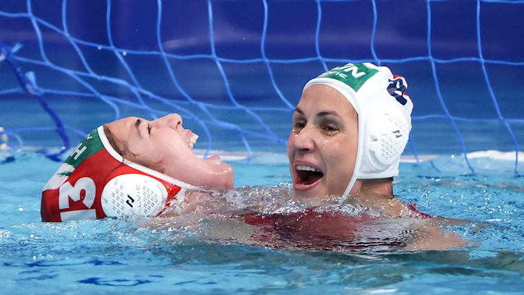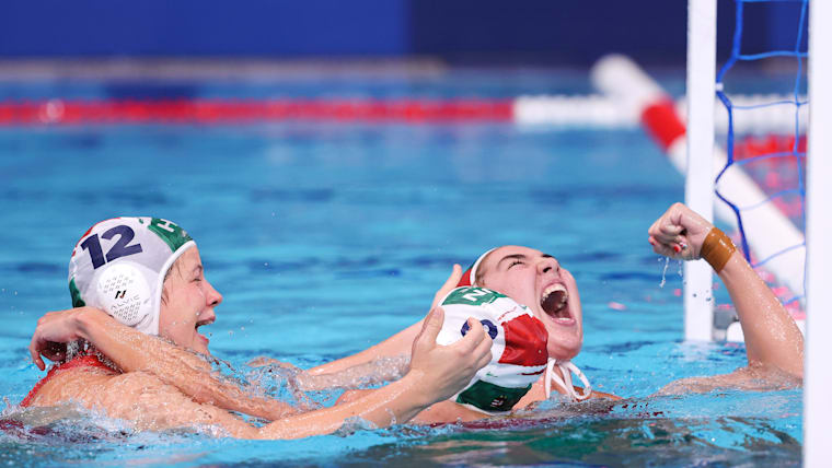 TOKYO, JAPAN - AUGUST 07: Ashleigh Johnson (L) and Amanda Longan of Team United States celebrate the win during the Women's Gold Medal match between Spain and the United States on day fifteen of the Tokyo 2020 Olympic Games at Tatsumi Water Polo Centre on August 07, 2021 in Tokyo, Japan. (Photo by Atsushi Tomura/Getty Images)