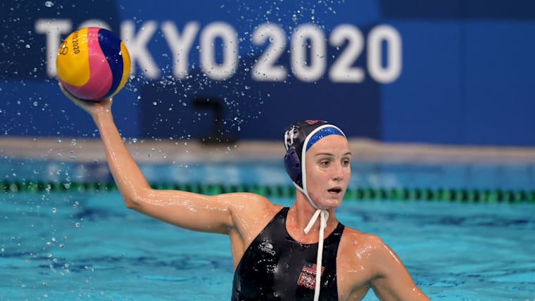 TOKYO, JAPAN - JULY 28: Makenzie Fischer of Team United States on attack during the Women's Preliminary Round Group B match between Hungary and the United States on day five of the Tokyo 2020 Olympic Games at Tatsumi Water Polo Centre on July 28, 2021 in Tokyo, Japan. (Photo by Al Bello/2021 Getty Images)