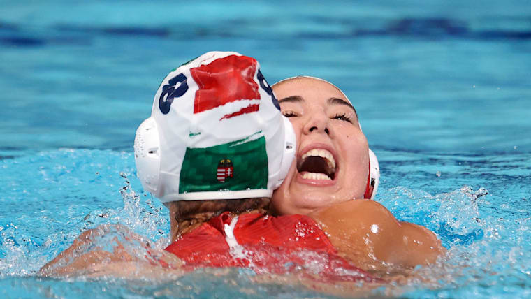 TOKYO, JAPAN - JULY 28: Rita Keszthelyi (L) and Alda Magyari of Team Hungary celebrate a 10-9 win over Team United States during the Women's Preliminary Round Group B match between Hungary and the United States on day five of the Tokyo 2020 Olympic Games at Tatsumi Water Polo Centre on July 28, 2021 in Tokyo, Japan. (Photo by Al Bello/2021 Getty Images)