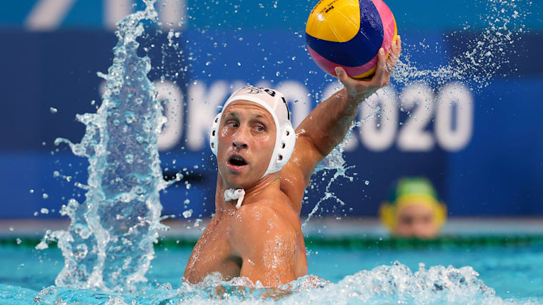 TOKYO, JAPAN - JULY 29: Drew Holland of Team United States makes a save during the Men's Preliminary Round Group A match between the United States and Italy on day six of the Tokyo 2020 Olympic Games at Tatsumi Water Polo Centre on July 29, 2021 in Tokyo, Japan. (Photo by Alexander Hassenstein/2021 Getty Images)
