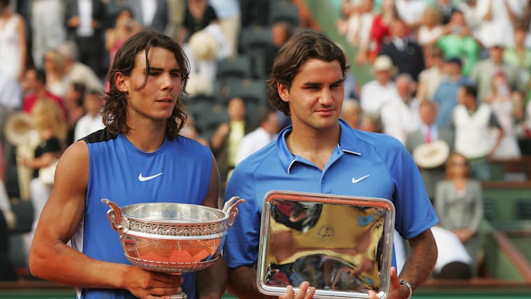 PARIS - JUNE 11: Rafael Nadal (L) of Spain looks on after defeating Roger Federer (R) of Switzerland during the Men's Singles Final on day fifteen of the French Open at Roland Garros on June 11, 2006 in Paris, France. (Photo by Matthew Stockman/Getty Images)