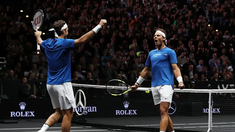 GENEVA, SWITZERLAND - SEPTEMBER 20: Rafael Nadal of Team Europe and teammate Roger Federer celebrate during the singles match between Stefanos Tsitsipas of Team Europe and Taylor Fritz of Team World during Day One of the Laver Cup 2019 at Palexpo on September 20, 2019 in Geneva, Switzerland. The Laver Cup will see six players from the rest of the World competing against their counterparts from Europe. Team World is captained by John McEnroe and Team Europe is captained by Bjorn Borg. The tournament runs from September 20-22. (Photo by Julian Finney/Getty Images for Laver Cup)