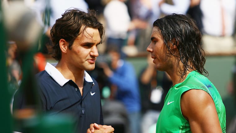 PARIS - JUNE 08: Rafael Nadal of Spain shakes hands with Roger Federer (L) of Switzerland, followinghis victory during the Men's Singles Final match on day fifteen of the French Open at Roland Garros on June 8, 2008 in Paris, France. (Photo by Julian Finney/Getty Images)