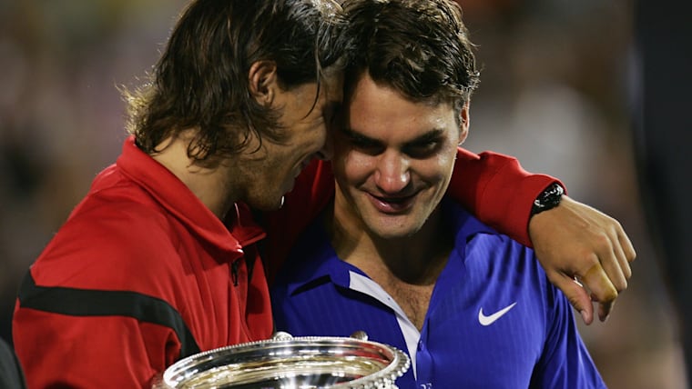 MELBOURNE, AUSTRALIA - FEBRUARY 01: Rafael Nadal of Spain consoles Roger Federer of Switzerland during the trophy presentation after his men's final match during day fourteen of the 2009 Australian Open at Melbourne Park on February 1, 2009 in Melbourne, Australia. (Photo by Scott Barbour/Getty Images)