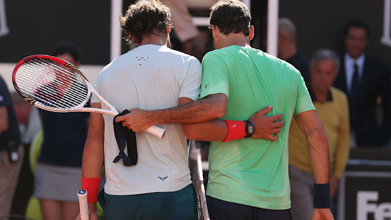 ROME, ITALY - MAY 19: Rafael Nadal of Spain walks off the court at the net after his straight sets victory against Roger Federer of Switzerland in their final match during day eight of the Internazionali BNL d'Italia 2013 at the Foro Italico Tennis Centre on May 19, 2013 in Rome, Italy. (Photo by Clive Brunskill/Getty Images)