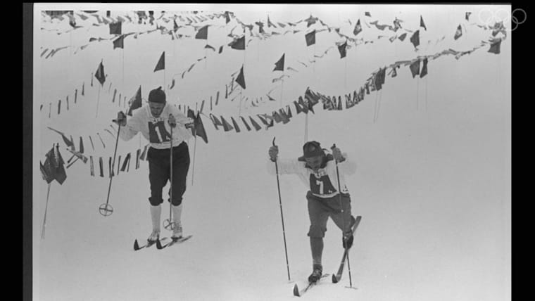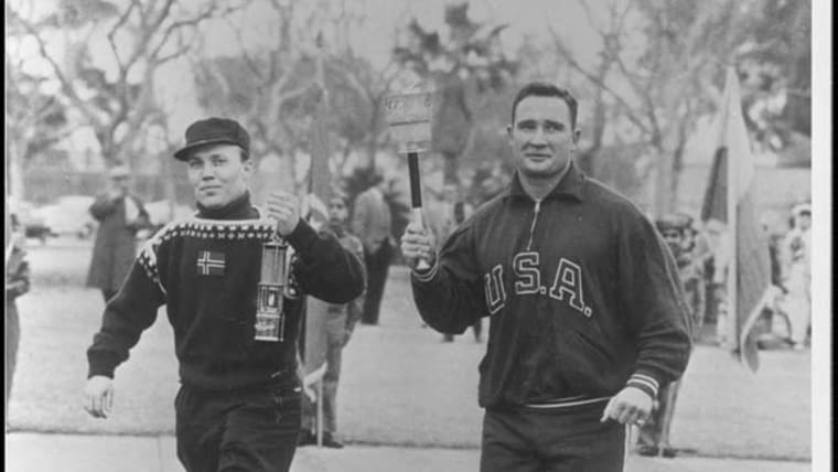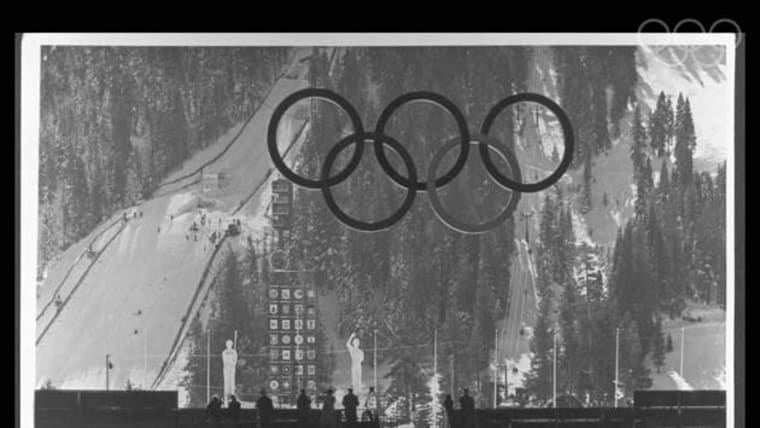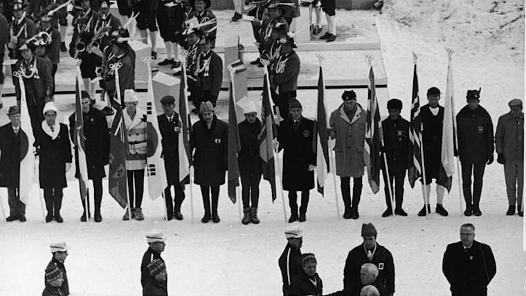 The flag of the 1960 Squaw Valley Winter Olympics is presented to the Mayor of Innsbruck Dr Alois Lugger and IOC President Avery Brundage (center) during the opening ceremonies of the IX Winter Olympic Games as a line of national representatives with the flags of their respective countries and a traditional Alpine band stand by, Innsbruck, Austria, January 29, 1960. (Photo by Pictorial Parade/Getty Images)