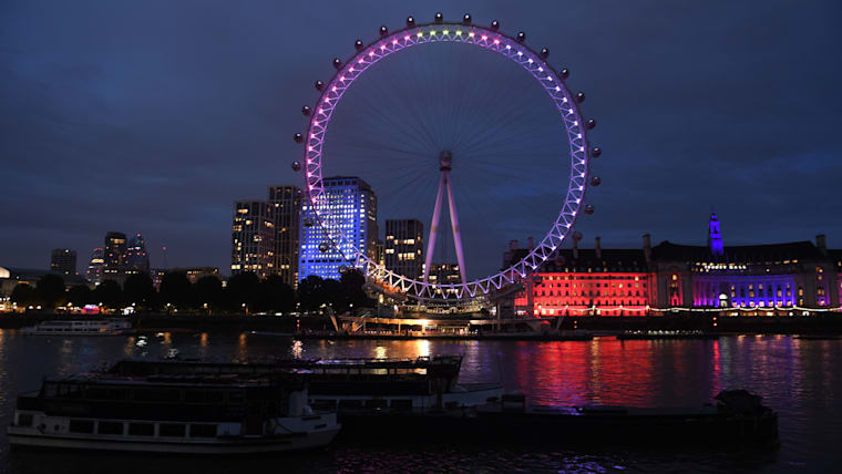 LONDON, ENGLAND - AUGUST 09: The London Eye is specially lit in support of the forthcoming Paralympic Games in Tokyo and the #wethe15 campaign on August 09, 2021 in London, England. (Photo by Stuart C. Wilson/Getty Images)