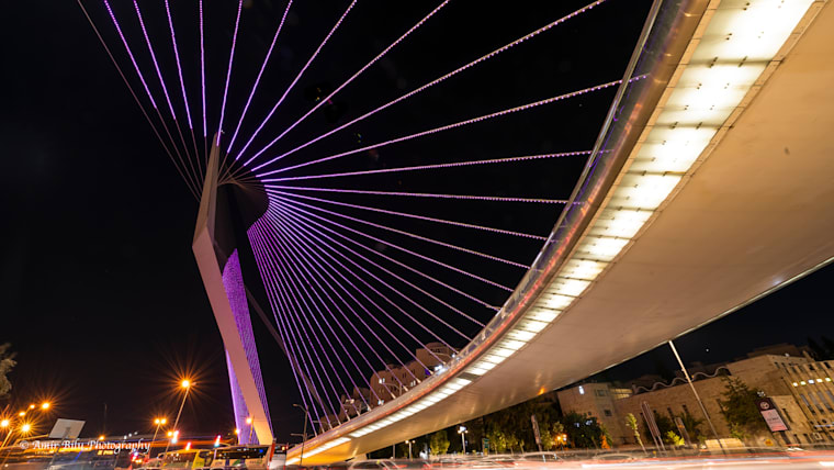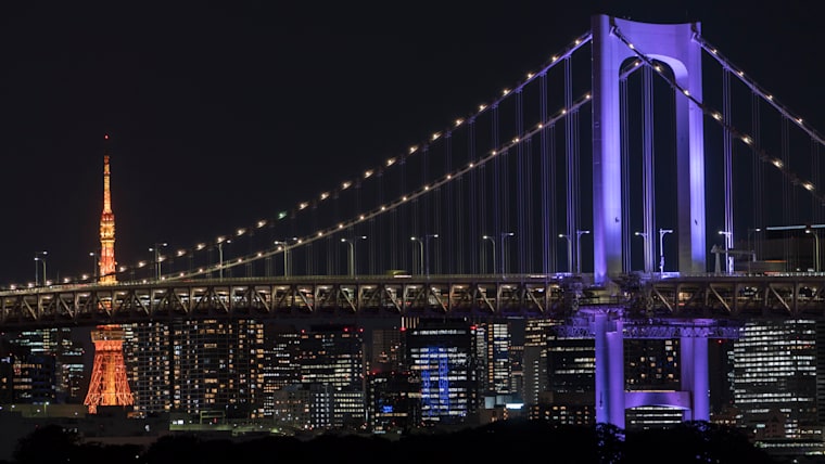 TOKYO, JAPAN - AUGUST 19: The Rainbow Bridge is illuminated in purple colored light during the WeThe15 campaign on August 19, 2021 in Tokyo, Japan. Launched ahead of the Tokyo 2020 Paralympic Games, WeThe15 aims to end discrimination towards persons with disabilities and act as a global movement publicly campaigning for disability visibility, inclusion, and accessibility. It brings together the biggest coalition ever of international organisations from the worlds of sport, human rights, policy, business, arts, and entertainment. (Photo by Tomohiro Ohsumi/Getty Images for International Paralympic Committee)