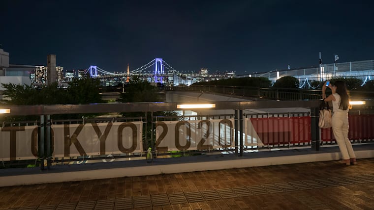 TOKYO, JAPAN - AUGUST 19: A woman takes a photograph in front of the Rainbow Bridge illuminated in purple colored light during the WeThe15 campaign on August 19, 2021 in Tokyo, Japan. Launched ahead of the Tokyo 2020 Paralympic Games, WeThe15 aims to end discrimination towards persons with disabilities and act as a global movement publicly campaigning for disability visibility, inclusion, and accessibility. It brings together the biggest coalition ever of international organisations from the worlds of sport, human rights, policy, business, arts, and entertainment. (Photo by Tomohiro Ohsumi/Getty Images for International Paralympic Committee)