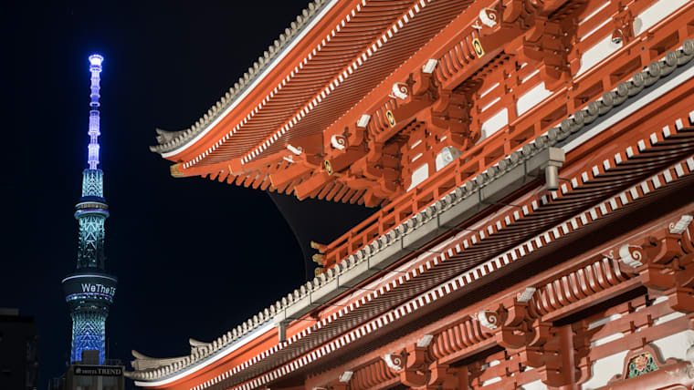 TOKYO, JAPAN - AUGUST 19: The Tokyo Skytree is illuminated in purple colored light, seen from Sensoji Temple, during the WeThe15 campaign on August 19, 2021 in Tokyo, Japan. Launched ahead of the Tokyo 2020 Paralympic Games, WeThe15 aims to end discrimination towards persons with disabilities and act as a global movement publicly campaigning for disability visibility, inclusion, and accessibility. It brings together the biggest coalition ever of international organisations from the worlds of sport, human rights, policy, business, arts, and entertainment. (Photo by Tomohiro Ohsumi/Getty Images for International Paralympic Committee)