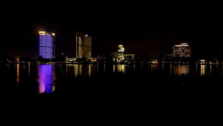 BONN, GERMANY - AUGUST 10: The DHL Deutsche Post tower stands illuminated on August 10, 2021 in Bonn, Germany. (Photo by Alexander Scheuber/Getty Images for International Paralympic Committee)