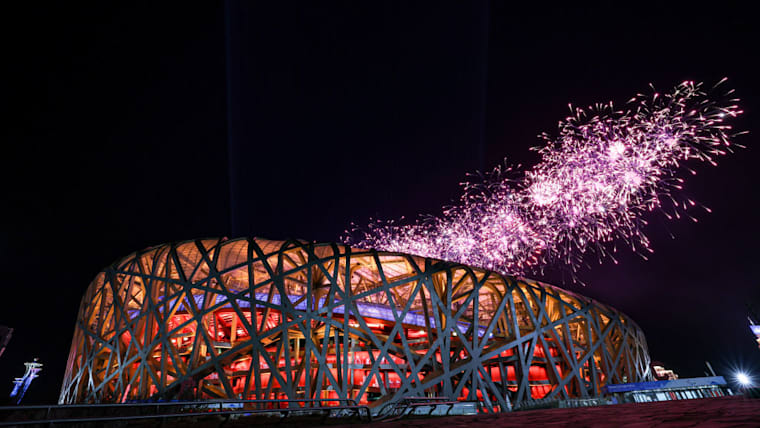 BEIJING, CHINA - MARCH 04: A firework display is seen above the stadium during the Opening Ceremony of the Beijing 2022 Winter Paralympics at the Beijing National Stadium on March 04, 2022 in Beijing, China. (Photo by Wang He/Getty Images for International Paralympic Committee)