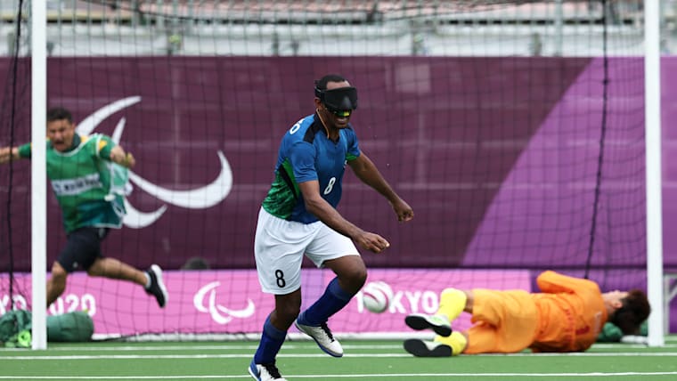 TOKYO, JAPAN - AUGUST 29: Raimundo Mendes of Team Brazil celebrates after scoring his team's first goal in the Football 5-a-side Preliminary Round Group A match between Team Brazil and Team China on day 5 of the Tokyo 2020 Paralympic Games at the Aomi Urban Sports Park on August 29, 2021 in Tokyo, Japan. (Photo by Kiyoshi Ota/Getty Images)