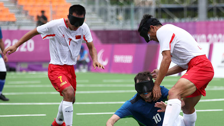 TOKYO, JAPAN - AUGUST 29: Ricardo Alves (R) of Team Brazil competes for the ball against Liu Meng (L) and Zhang Jiabin (C) of Team China during the Football 5-a-side Preliminary Round Group A match between Team Brazil and Team China on day 5 of the Tokyo 2020 Paralympic Games at the Aomi Urban Sports Park on August 29, 2021 in Tokyo, Japan. (Photo by Kiyoshi Ota/Getty Images)