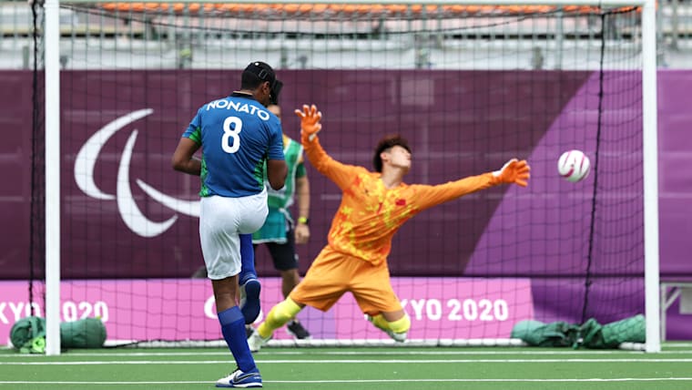 TOKYO, JAPAN - AUGUST 29: Raimundo Mendes of Team Brazil kicks a penalty to score his team's first goal in the Football 5-a-side Preliminary Round Group A match between Team Brazil and Team China on day 5 of the Tokyo 2020 Paralympic Games at the Aomi Urban Sports Park on August 29, 2021 in Tokyo, Japan. (Photo by Kiyoshi Ota/Getty Images)