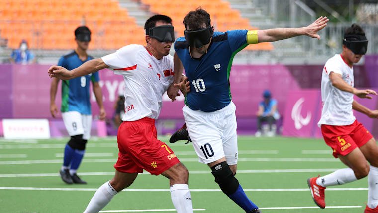 TOKYO, JAPAN - AUGUST 29: Ricardo Alves (R) of Team Brazil and Yu Yutan of Team China compete for the ball during the Football 5-a-side Preliminary Round Group A match between Team Brazil and Team China on day 5 of the Tokyo 2020 Paralympic Games at the Aomi Urban Sports Park on August 29, 2021 in Tokyo, Japan. (Photo by Kiyoshi Ota/Getty Images)
